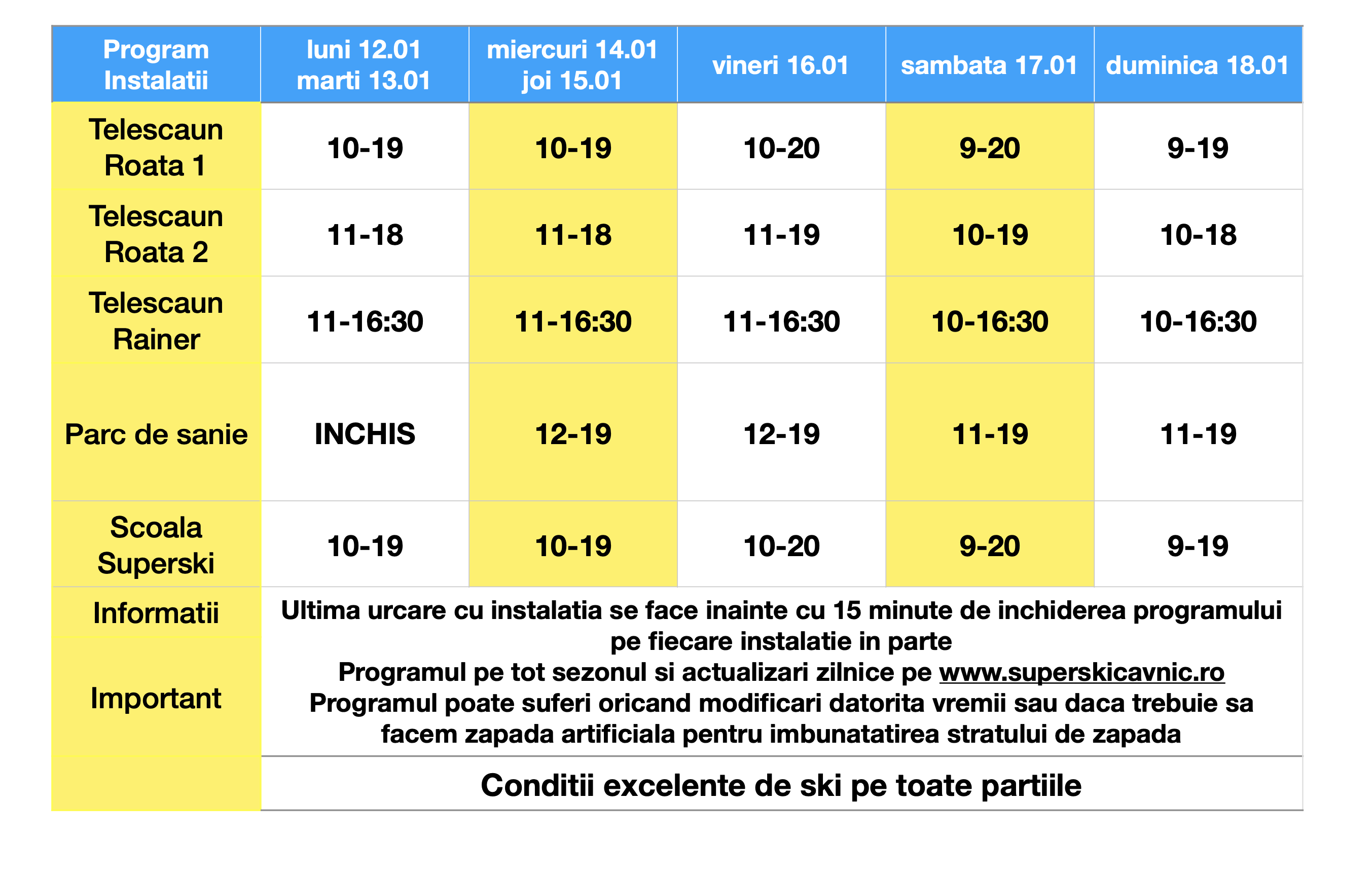 *Programul este informativ si poate suferi oricand modificari daca conditiile meteo nu permit functionarea instalatiilor