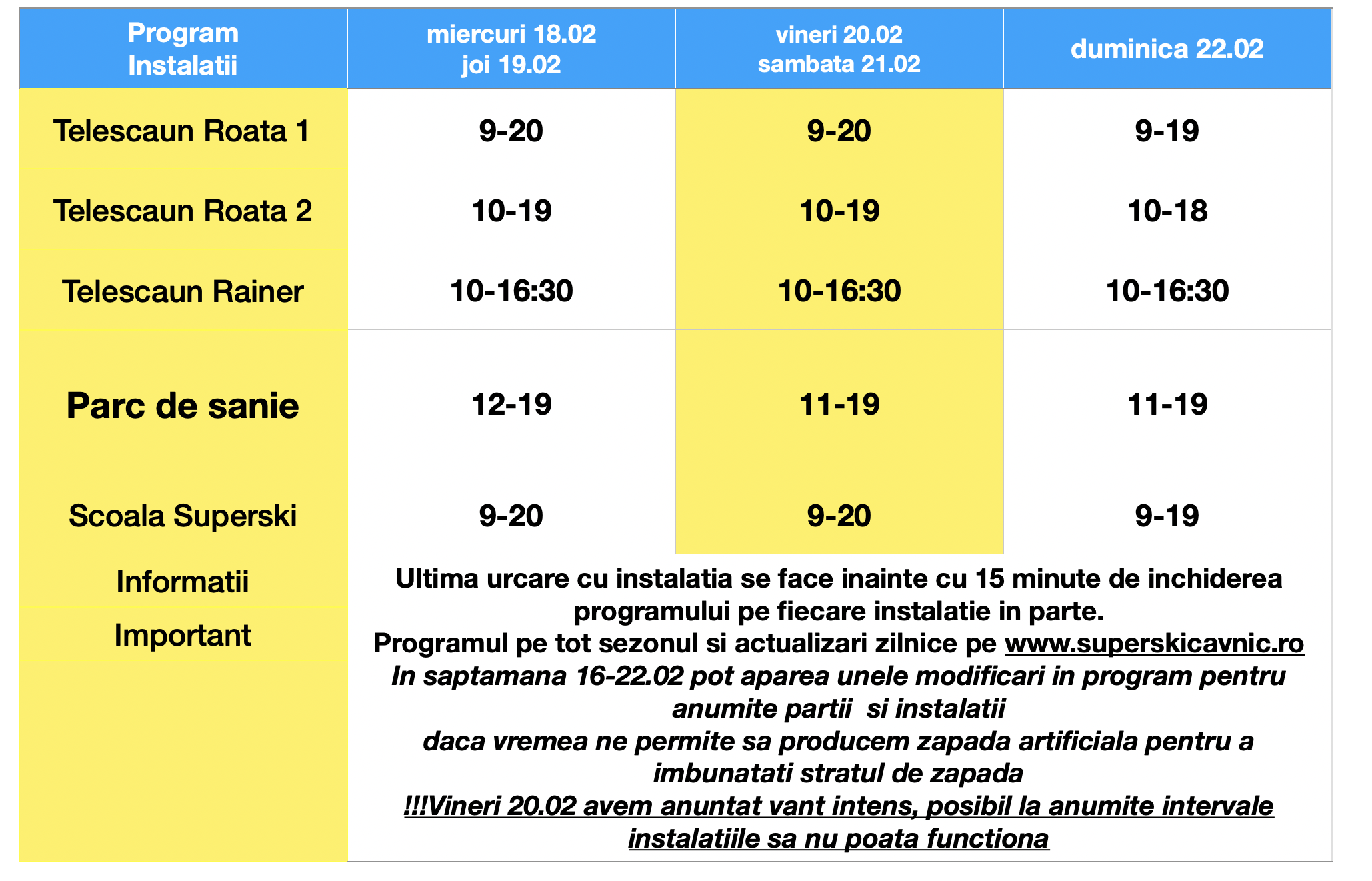 *Programul este informativ si poate suferi oricand modificari daca conditiile meteo nu permit functionarea instalatiilor sau daca este frig si trebuie sa facem zapada pentru a imbunatati stratul de zapada